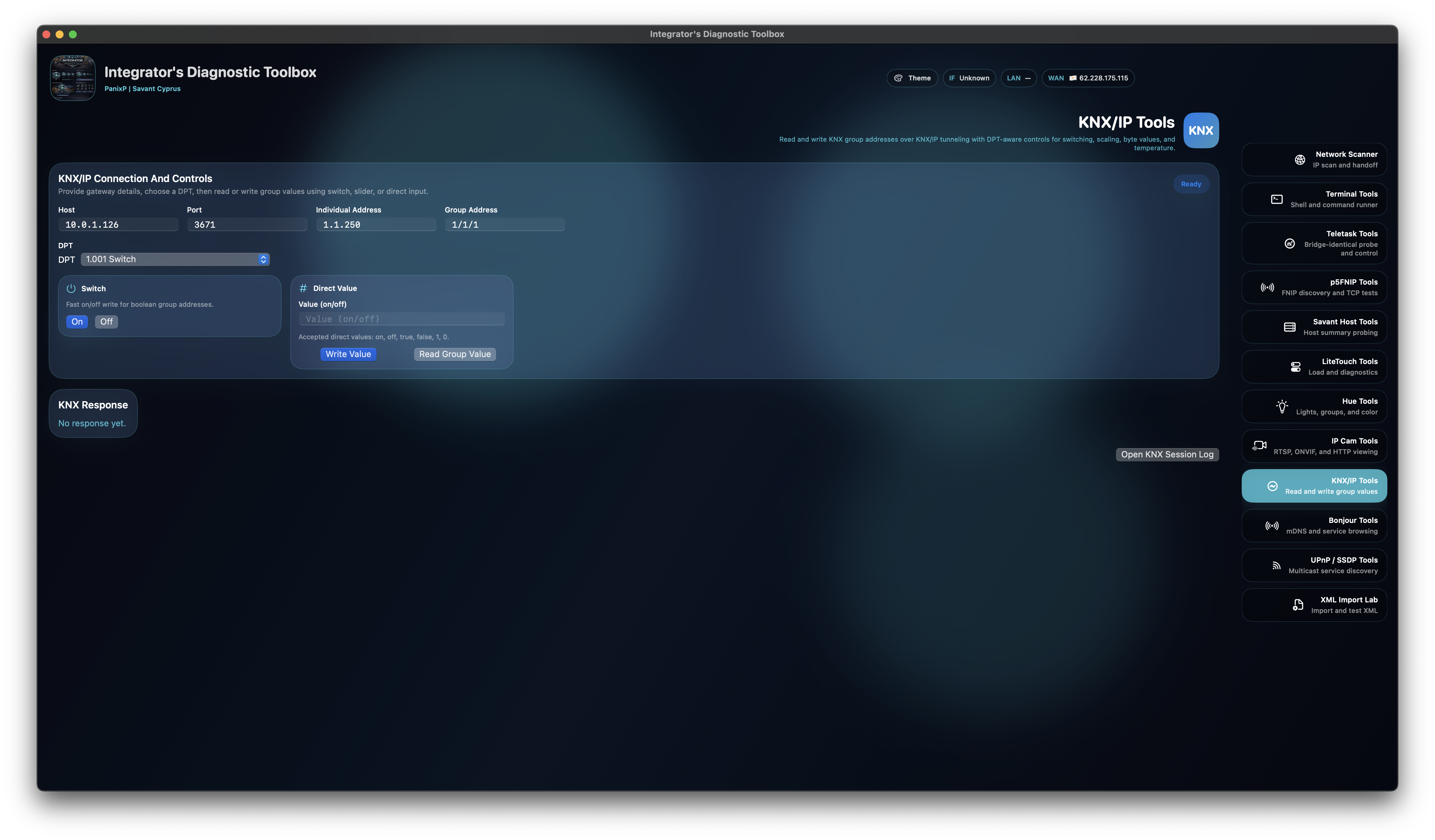 Hue control, legacy Savant LiteTouch diagnostics, RTSP/IP camera tests, Bonjour browsing, SSDP discovery, KNX/IP command tools, and terminal utilities support broader site-validation workflows around the main Savant stack, while the FNIP layer covers the full p5.hu product family and the built-in KNX tool stands out as a flagship macOS testing surface.