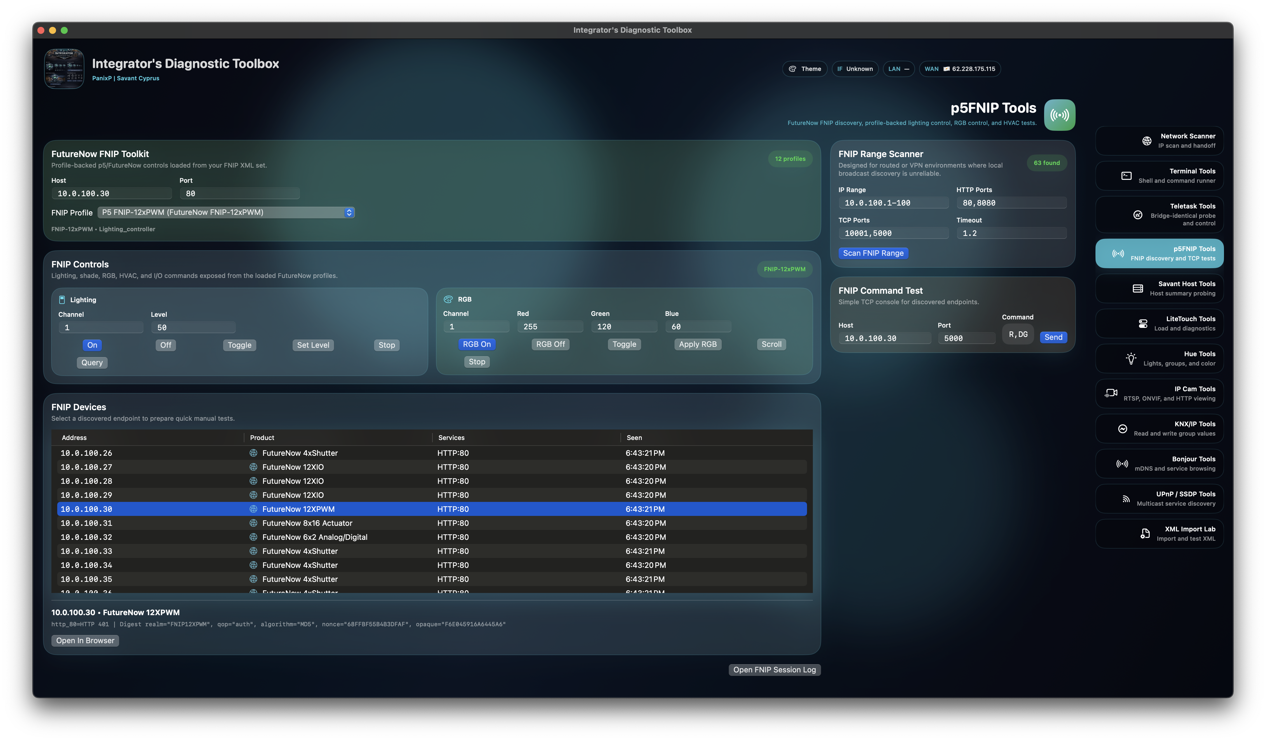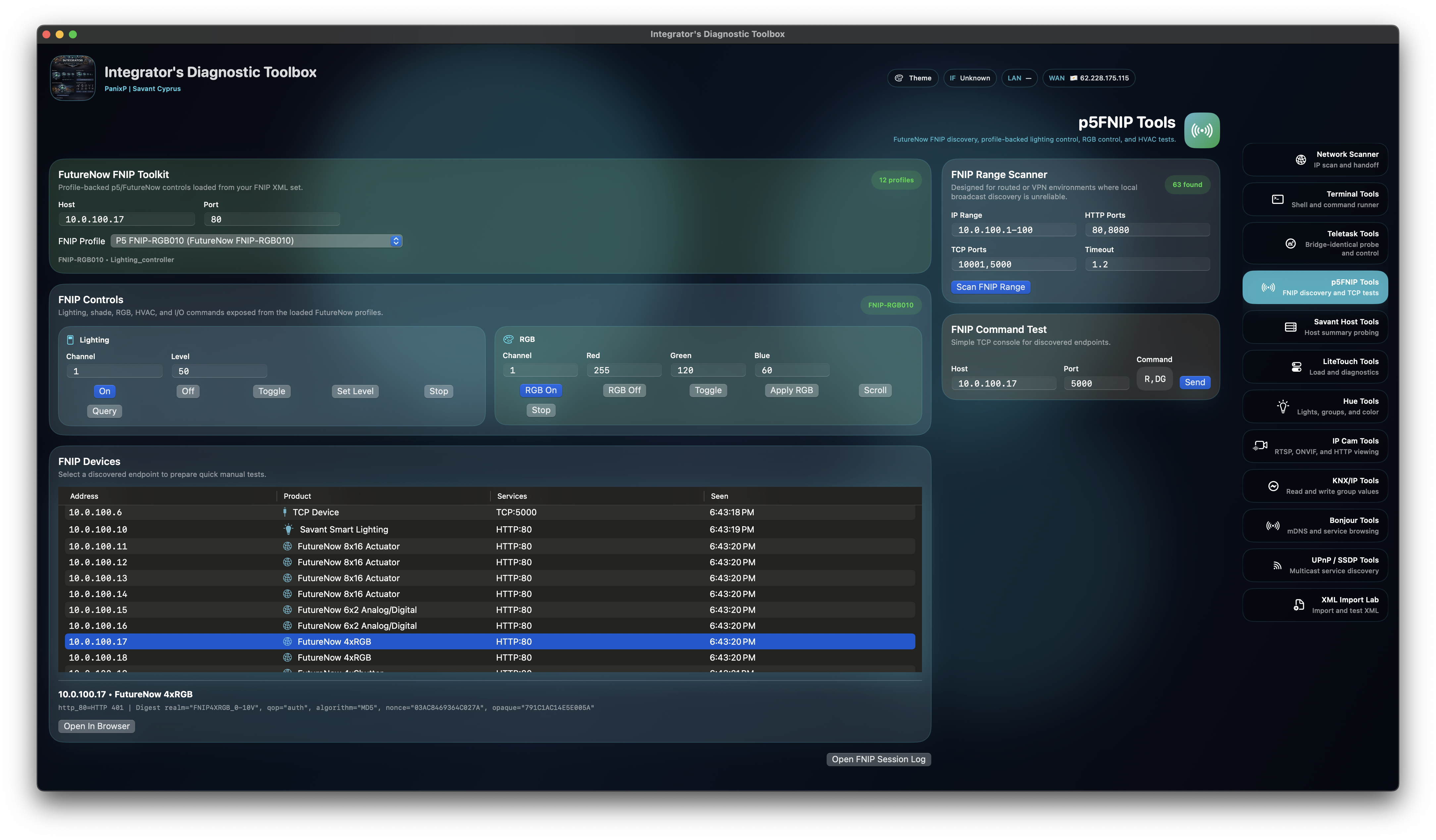 FNIP diagnostics with range expansion, HTTP/TCP probing, product hints, service matching, direct command send, and built-in support for 100% of p5.hu FNIP products for discovery and test control.